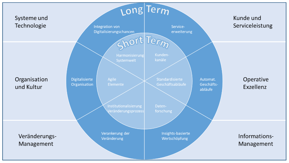 In der Transformation hin zu einem digitalisierten Unternehmen werden stets mehrere Dimensionen des Unternehmens und der Wertschöpfung angesprochen. Es geht dabei nicht um die simple Implementierung einzelner Digitalisierungslösungen wie beispielsweise intelligenterer Ressourcenplanung oder Call Routing. Vielmehr durchdringt der Digitalisierungsansatz phasenweise alle Dimensionen, welche die Unternehmung auch bisher zu einem erfolgreichen Marktteilnehmer haben werden lassen. Um dies auch zukünftig sicherzustellen, bedarf es einer umfassenden und integrativen Betrachtung der einzelnen Dimensionen.